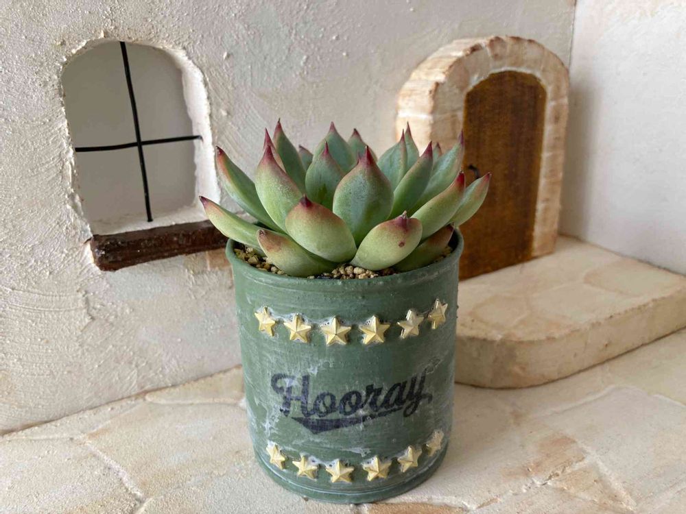 リメ缶に、葉挿しっ子の桃太郎さんを植えてみました😊