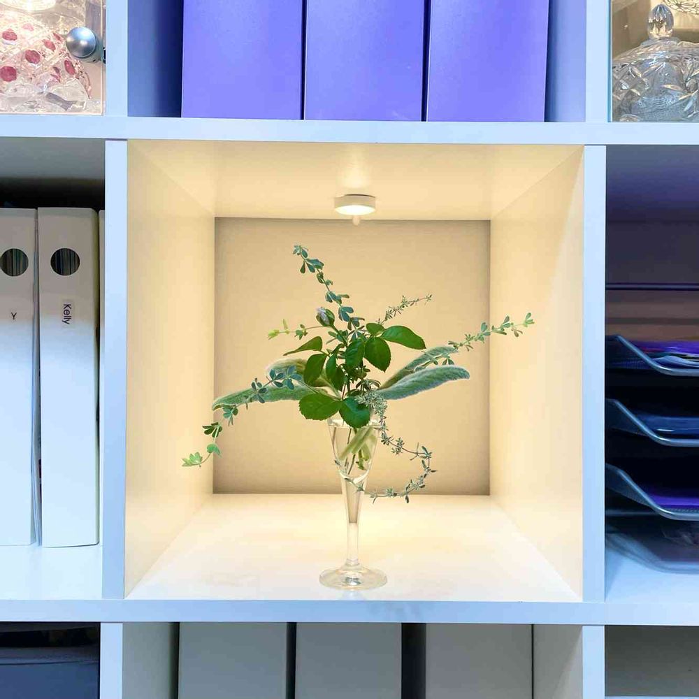 リビングのシェルフ、書類たくさんですが、ひとマスだけフリーで空けてあるんですよ🤭ぎっしりな花籠だとそうは見えないんだけど、ほんとですね!小さな花だと額みたい🫢