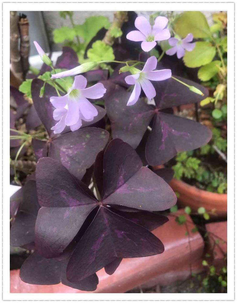 オキザリス。ゼラニウムの鉢の中から、毎年出てくる😆雑草かと思って、いつも抜いてポイしてました😅良く見たら小さなピンクのお花と紫色の葉っぱが可愛いです🎶