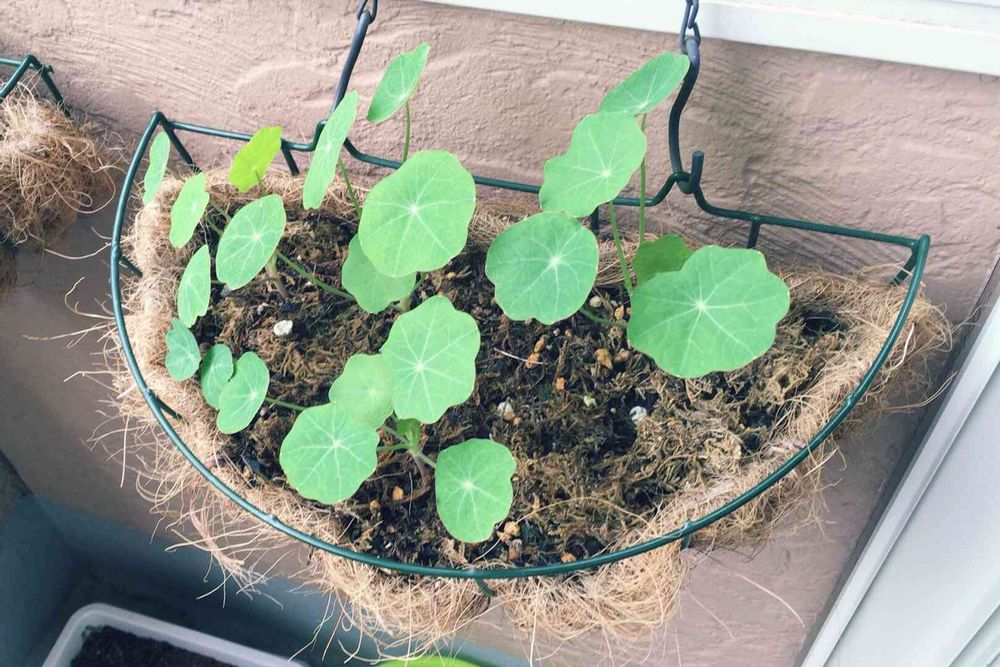 ナスタチュームはベランダでハンギングバスケットにしました。