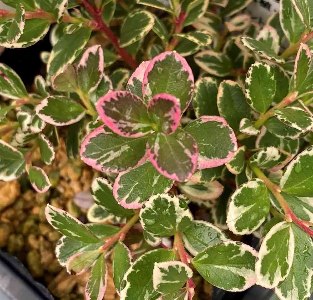 斑入り葉コケモモ、葉の先端が赤く色ずいています。