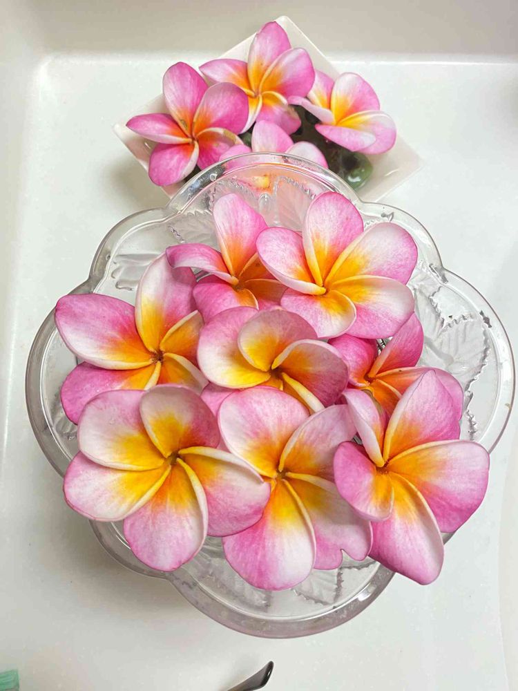 風で痛む前にプルメリアの花を摘んで来て食卓や洗面台に飾りました。