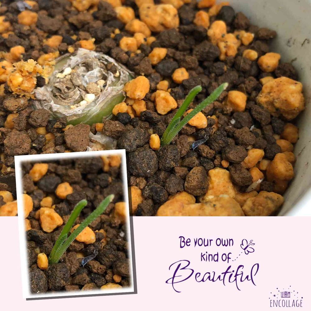 雨が降る中ベランダで植木達を見ていたら…先週植え替えした アルプカナマクエンシスさんが(〃艸〃)可愛いい❤️ちっこい葉っぱを出してました。
