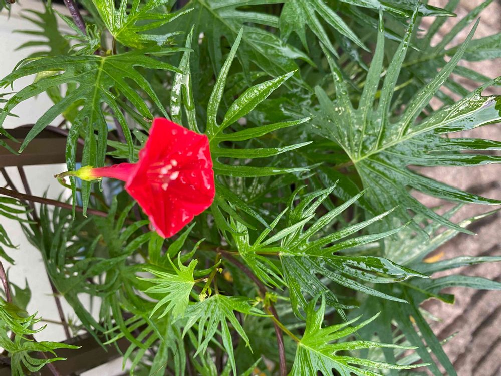 この花は、ハゴロモルコウソウ(羽衣縷紅草)で、別の名がモミジバルコウソウ(紅葉葉縷紅草)だそうです。
