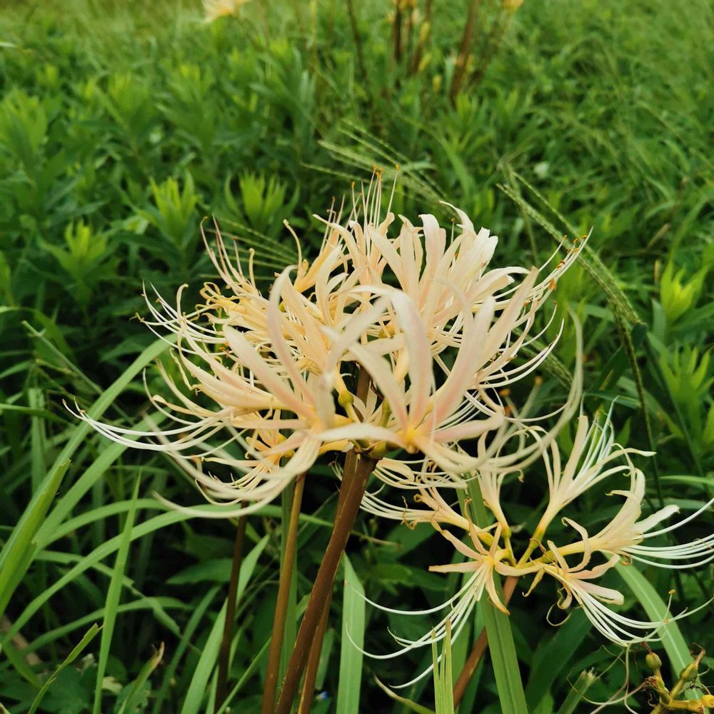 ヒガンバナ(赤)とショウキズイセン(黄色)の自然交雑種とのことです。赤と黄色で白とは面白いですね✨