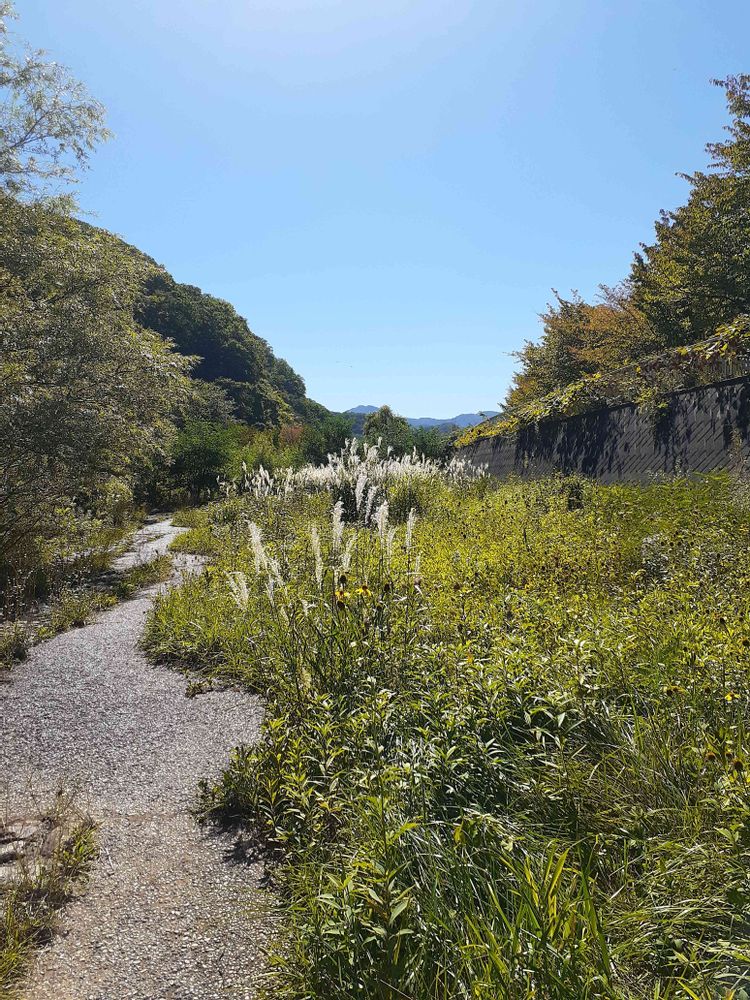 右上がサイクリングロード🚴♀️左に発寒川が流れています。ススキや野の花がいっぱいの散歩道が川沿いにずっと続いています。