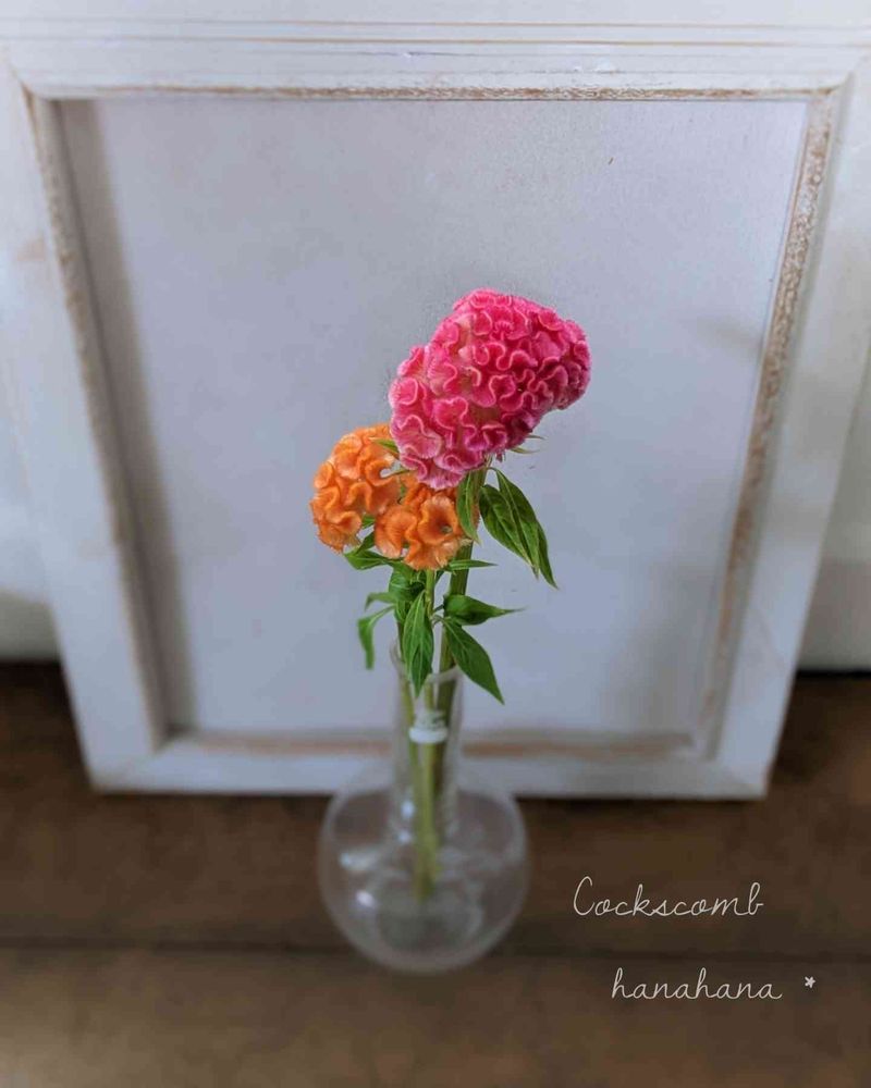 ピンクとオレンジのケイトウをフラスコに💗🧡 色がとっても可愛くて癒やされます。