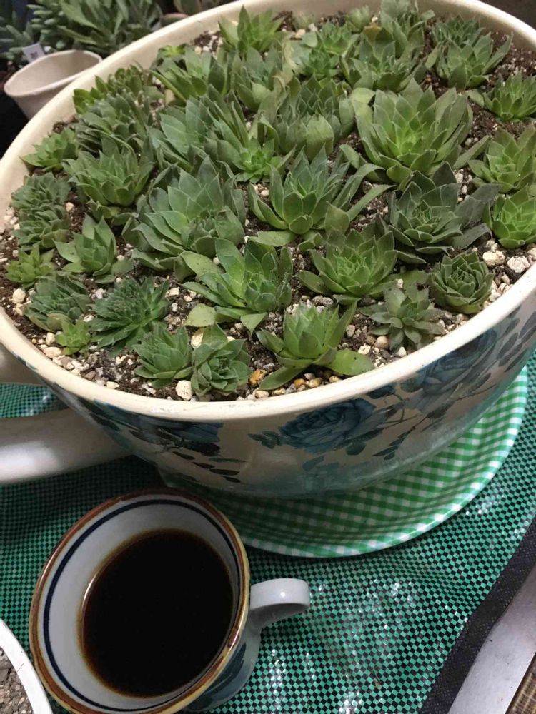 台風対策と植え替えで、テーブルは植物に占領された我が家室内でございます😄