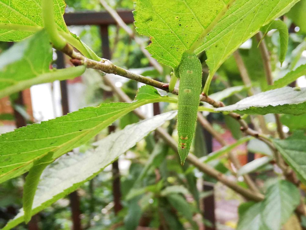 サクラの葉の裏にいた,齢のそれぞれ異なる3頭(写真左下,中央,右上)のモモスズメ(🦋)中齢幼虫。2022-09-23