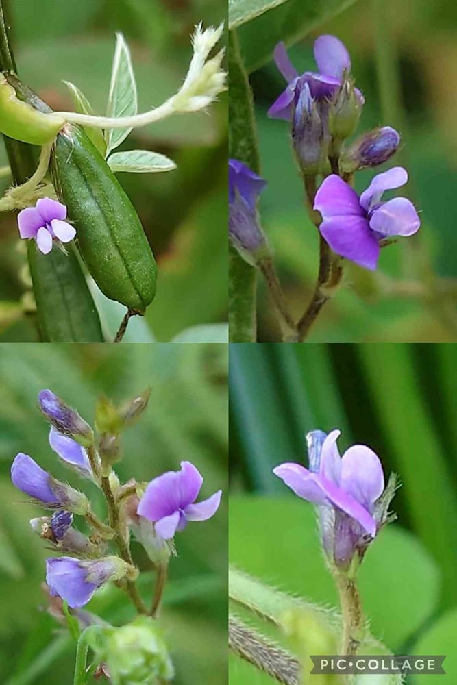 可愛い青紫色のツルマメ(ノマメ)の花を集めました、左上の花には大豆にそっくりの実が付いています💜🌿