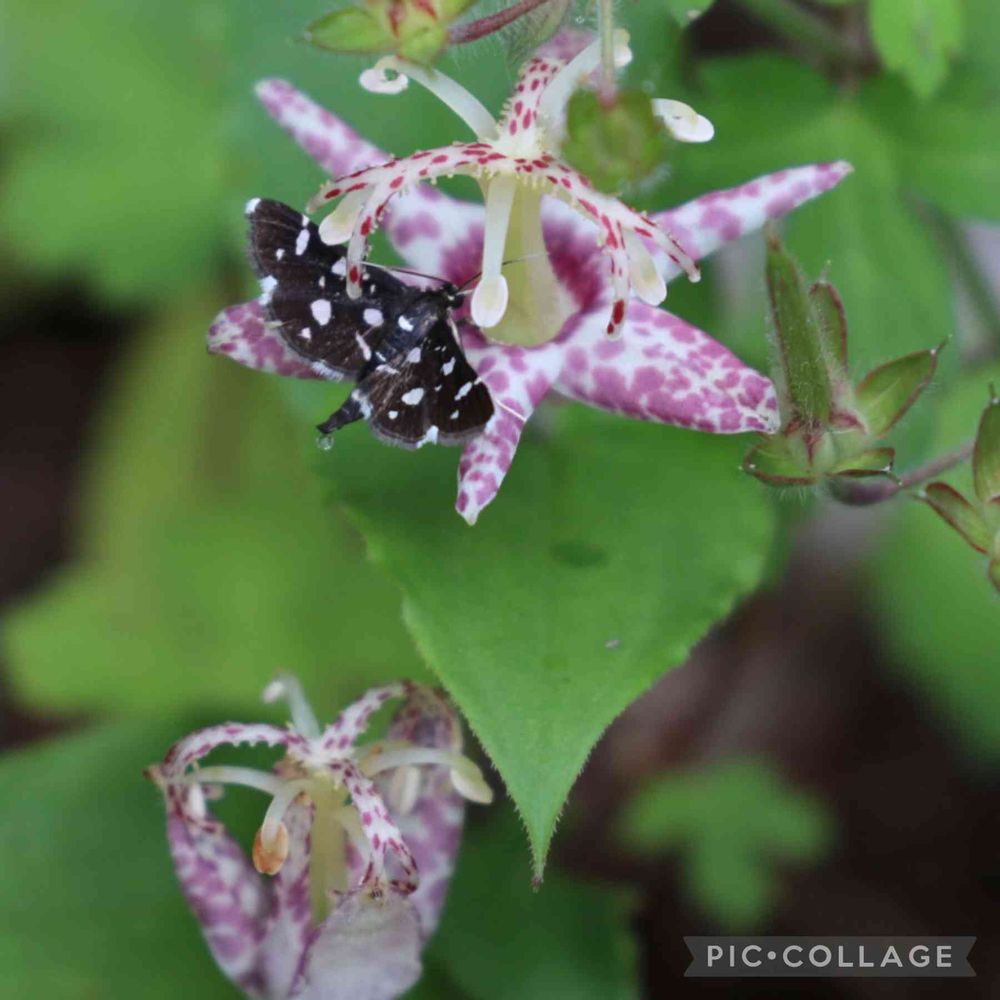 黒地に白い水玉模様の蛾が休憩中です💜🖤💜