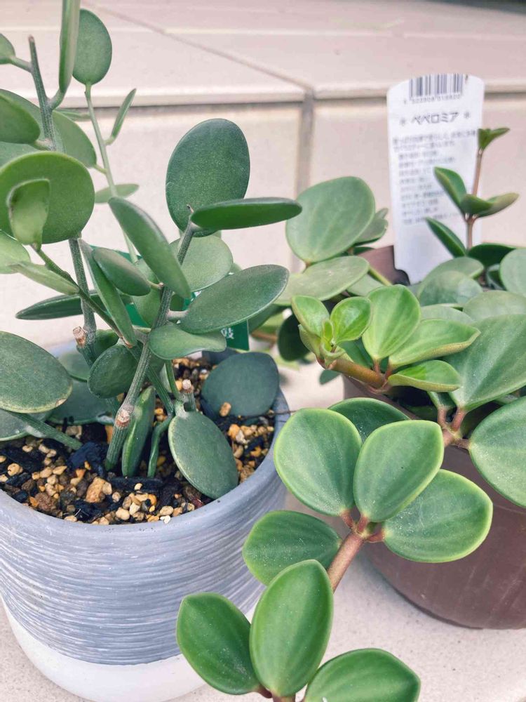 丸葉マニアです。グリーンドラム3鉢目。フリマアプリで購入しました。なかなか出ないんです。昨年2鉢購入し、冬越し夏越し成功。でもいまだに不明な子。隣のペペロミアホープ。農業系のホームセンターにありました。ペペロミアは寒さに弱いから、冬越しが心配です。