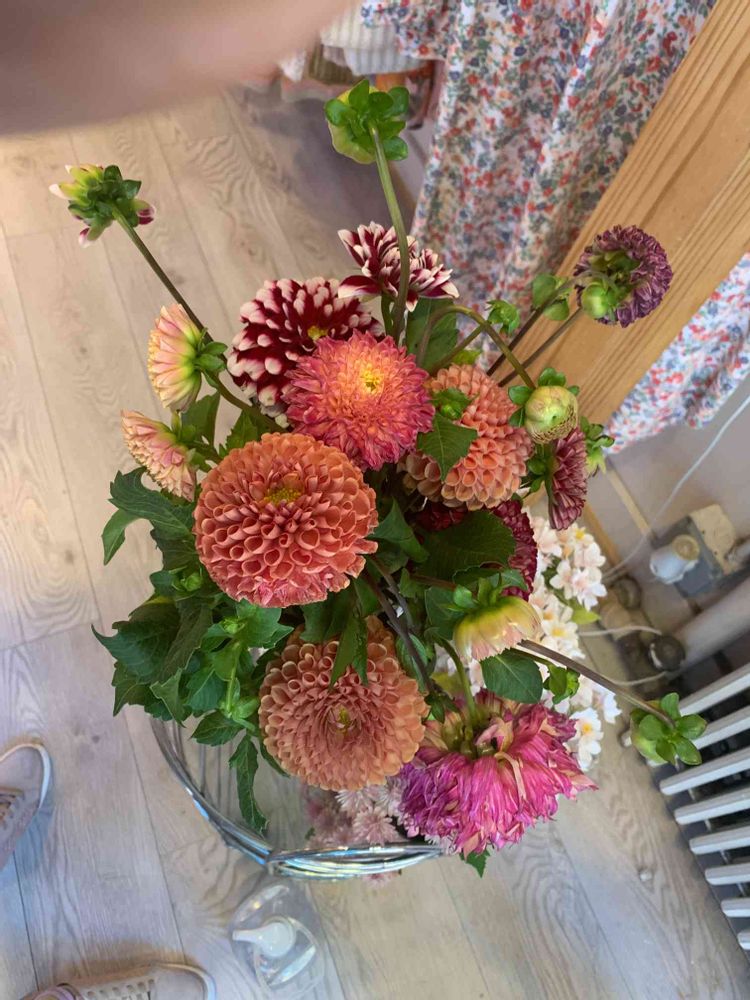 さん、店内見回すと可愛いお花のアレンジが真下で微笑んだので、パチリ😉ちょっと私の靴が入ってしまいましたが、お褒め頂き恐れ入ります😳😅👍