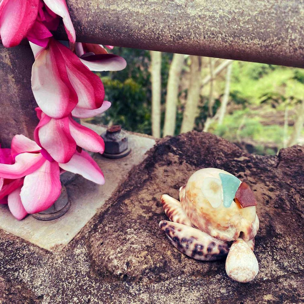 香りが高い素晴らしいレイを購入することができました🙏🏼右側にあるホヌの置物は、貝殻やシーグラスを使っておばちゃんが作ったのだそう。この日お孫さんがご誕生予定なのだとか😮おめでとうございます!