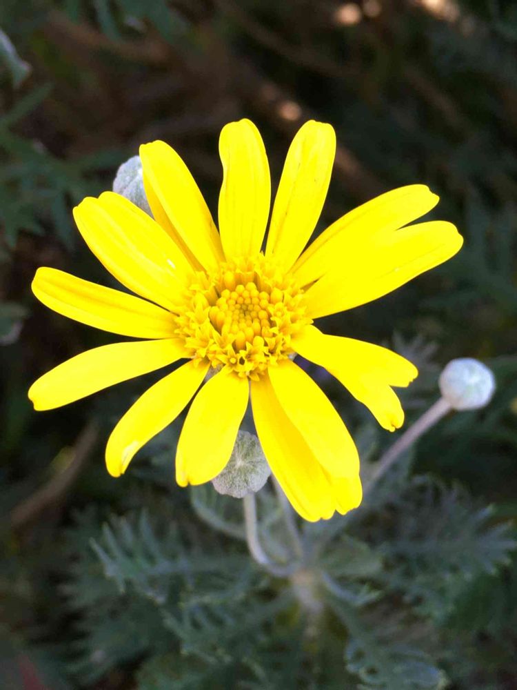 いくつか種類がありますが、普通は冒頭写真のペクティナツスがユリオプスデージーと呼ばれています。薄い銀色がのる切れこみの入った葉をもち、黄色の花を長期間咲かせます。株は大きくなると茎が木質化してさらに大きくなります。