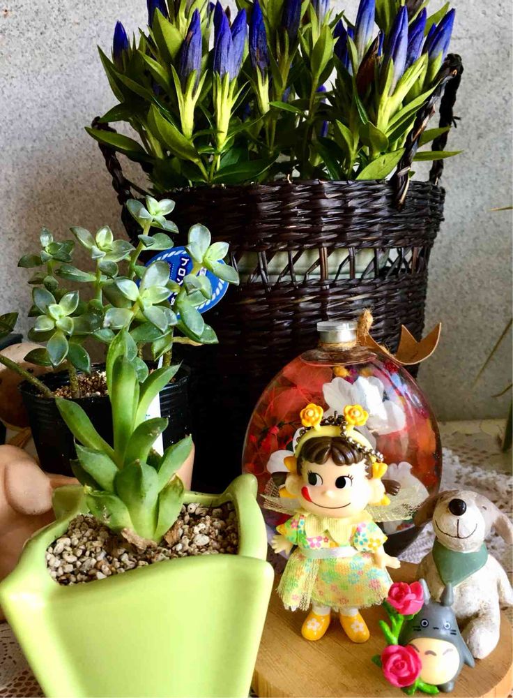 可愛いペコちゃんと大好きなりんどうのお花さんと多肉植物です。