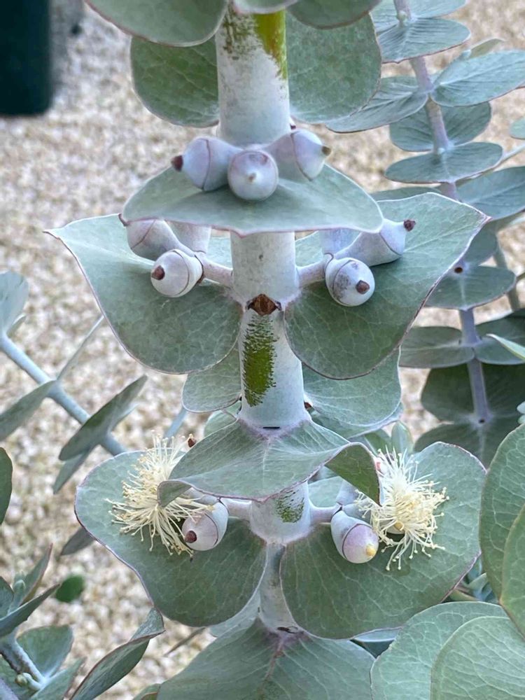 この夏お化けのように巨大に成長したユーカリの芯止め剪定をしました。いつもでかくなったなーと下から見上げていたので、花が咲いているのが葉っぱで隠れて見えてなくて、切ってからビックリ🫢マジマジと観察🔎😊