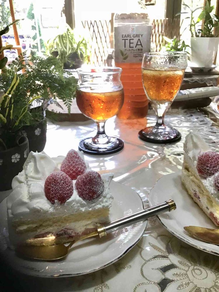 また 1 個ずつの 3角ショートケーキ🍰だと 感じが 出ないだろう〜🎂と ホールのを 買って来てくれましたが、、、ほんと2人きりなので、お昼は 大きく切ったケーキ と アイス アールグレイ が お食事 でした〜 ‼︎‼︎ 😳💦