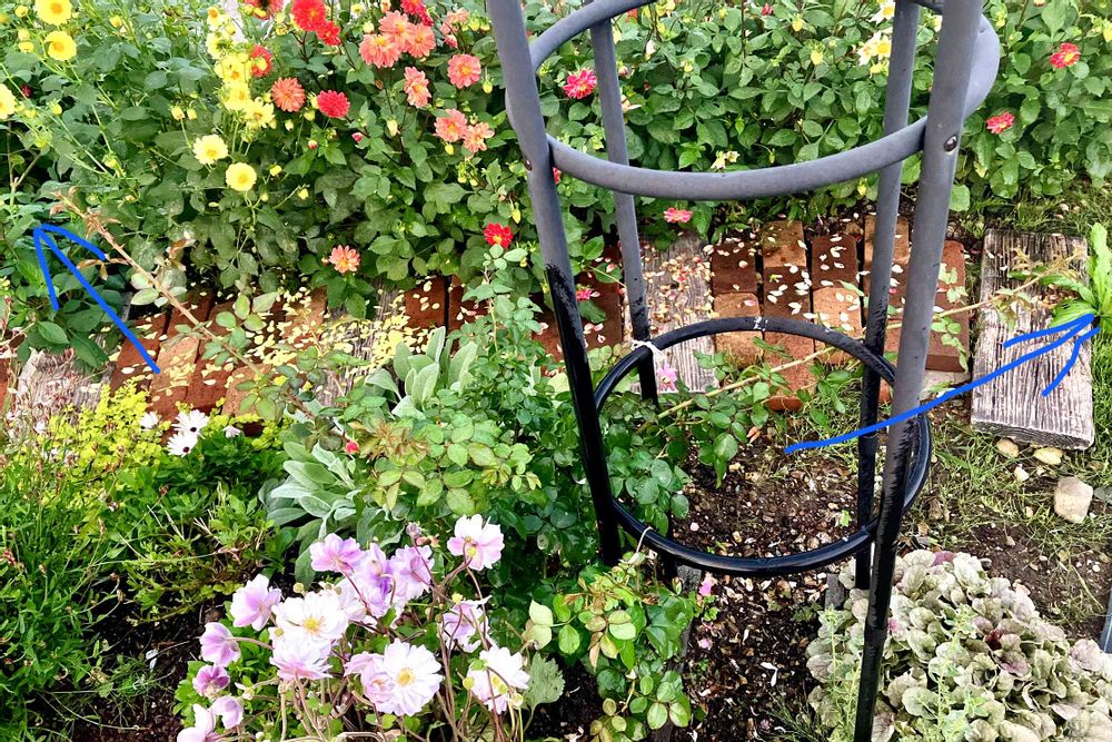バラのポンポネッラさんが右へ左へびょんびょん伸びてきました。ようやくオベリスクに絡ませられる…?