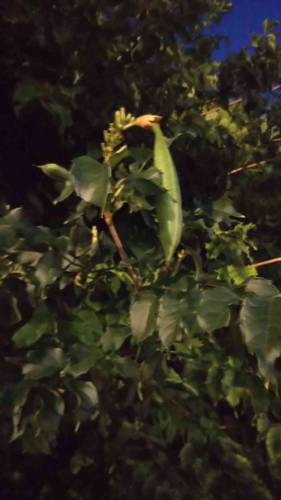 暗くなった公園に、ノウゼンカズラの実が。何とグリーンピースの鞘程ある実がぶら下がっていました。