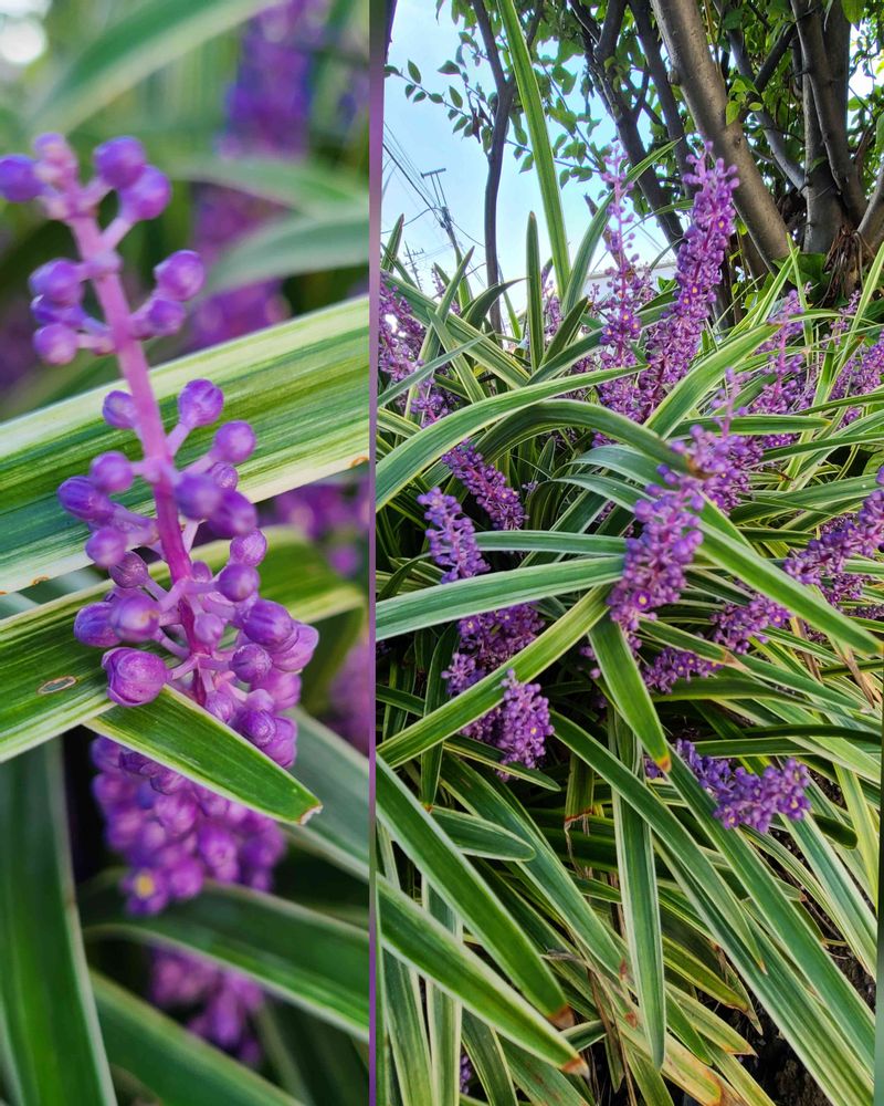 樹木の下に長い🌿が斑入りの💜のラン咲きのような花が綺麗に咲いてましたバシャリ🤳