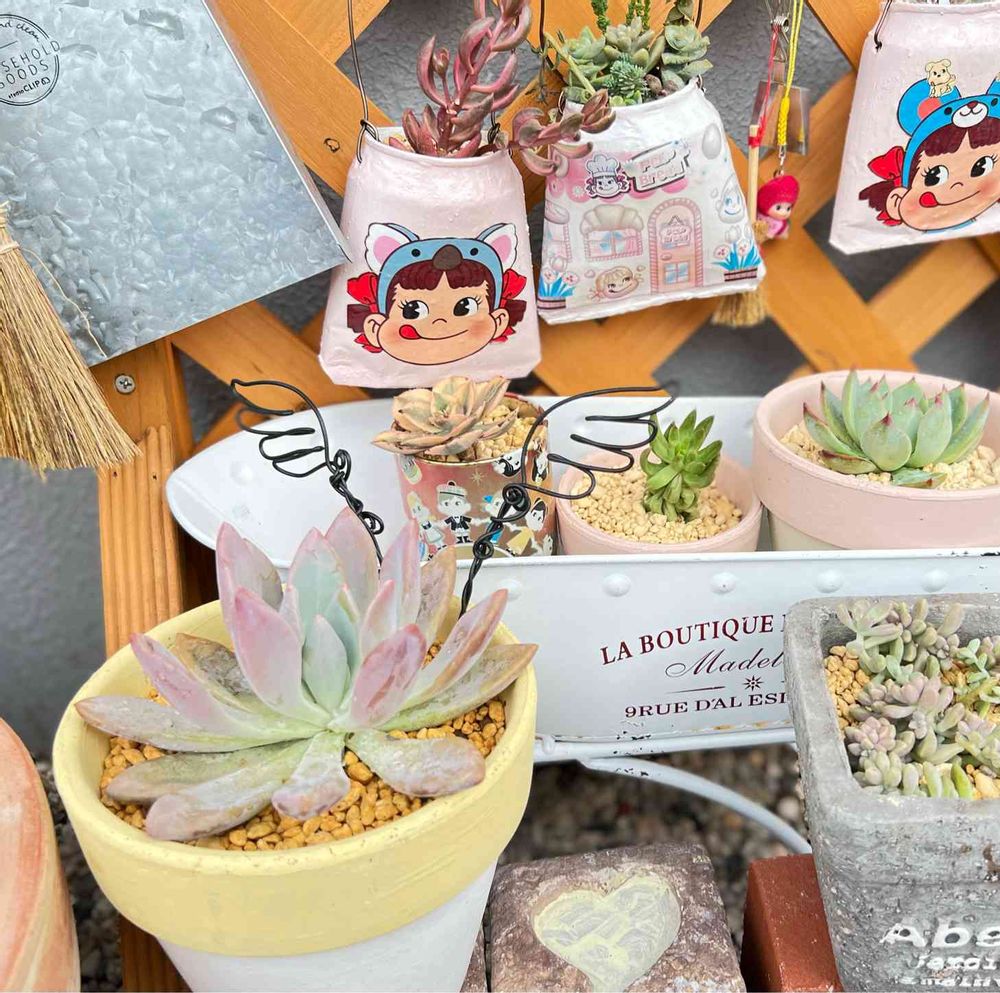 楽しい笑顔のペコちゃんと、そろぞれの個性にあわせた多肉植物の華やぎを、可愛い鉢に植えて、楽しい華やぎの世界を演出