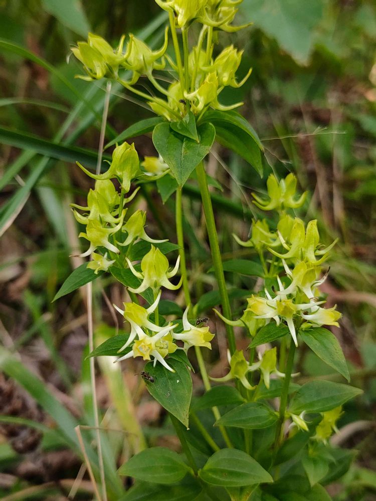 ✽花は茎頂と葉腋から出た柄につき、がくは全裂し、花冠は先が4深裂して裂片の下部が長く伸びて距となり船の碇のように四方に開出する