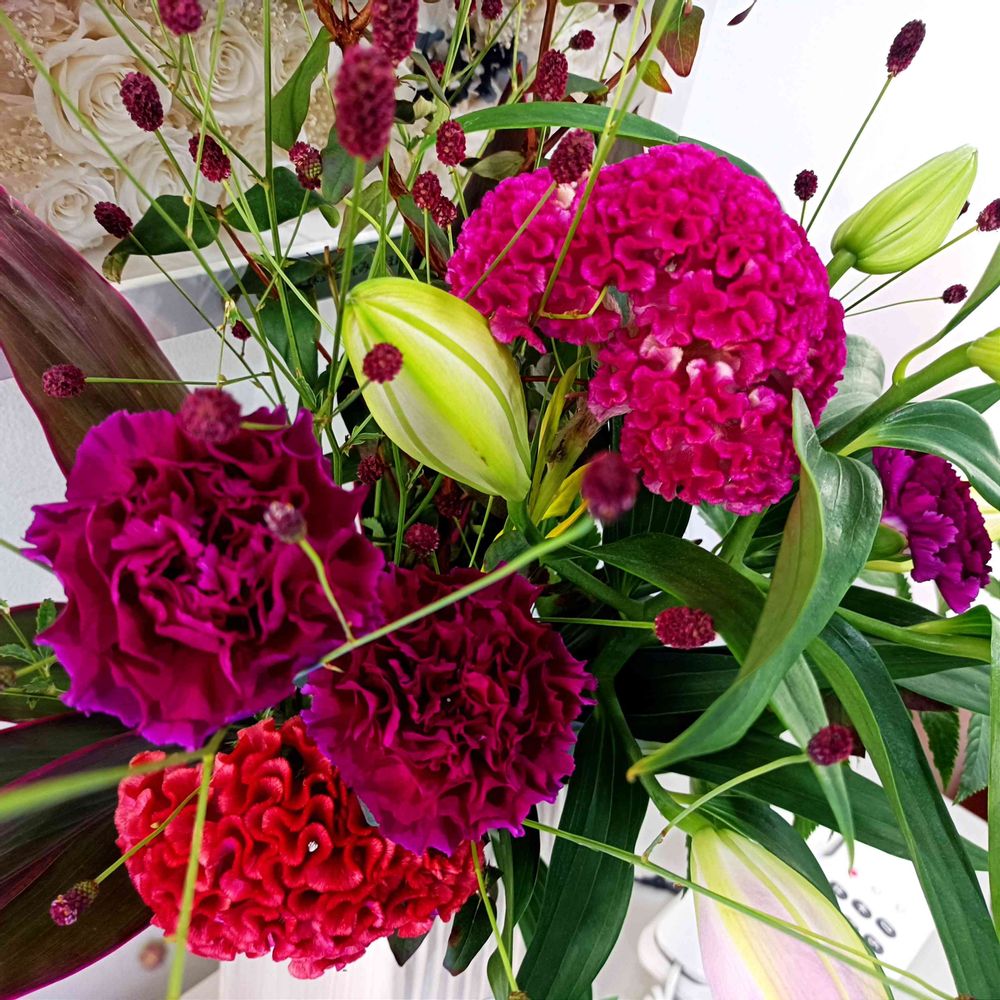 ワインレッドのカーネーションに目が行きましたよ😍綺麗な色ですね…