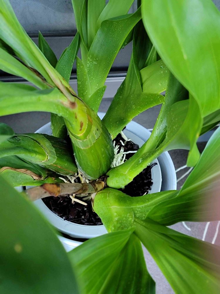 成長著しいので水好き。夏に植え替えたのにもう根が回ってバークから上向きに根が伸びてきた。