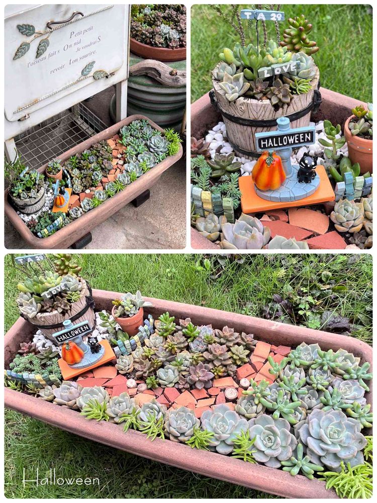ポストの前に転倒防止も兼ねて置いてある大きなプランターの多肉をハロウィン仕様に仕立て直しました🎃