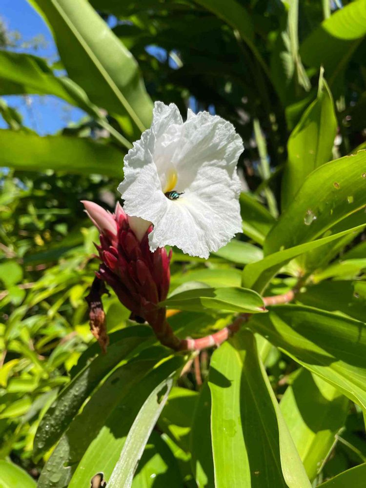 赤紫色の苞から白色で中央部が黄色のお花を咲かせます💛