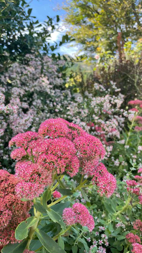 淡いピンク色のお花を背景に濃いピンク色のベンケイソウが映えていました😊💓