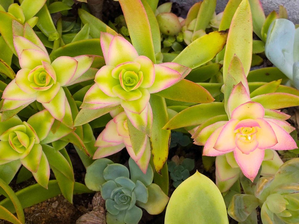 南側花壇の地植えの クラッスラ・火祭りの光りさんが 可愛く色付いてました😻💚💛💗