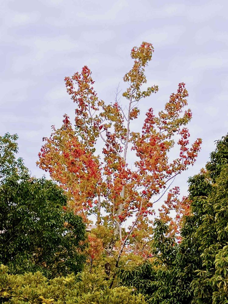 出勤途中で、バス停前の中央高校のモミジバフウの紅葉🍁が始まりました。