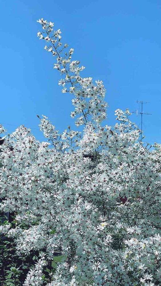 孔雀アスター綺麗よね🎵まっしろで💚我が家にも咲いてるけど切り花にしてるわよ❤️枝下てるから支柱たててしばってるわよ😅