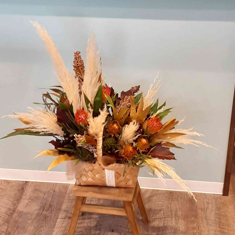 グレビレアゴールドお稽古で、秋バージョンの、アレンジを作ってきました、このままドライにさせます、沢山のお花の名前を覚えきれないけど、これも頭の体操😂