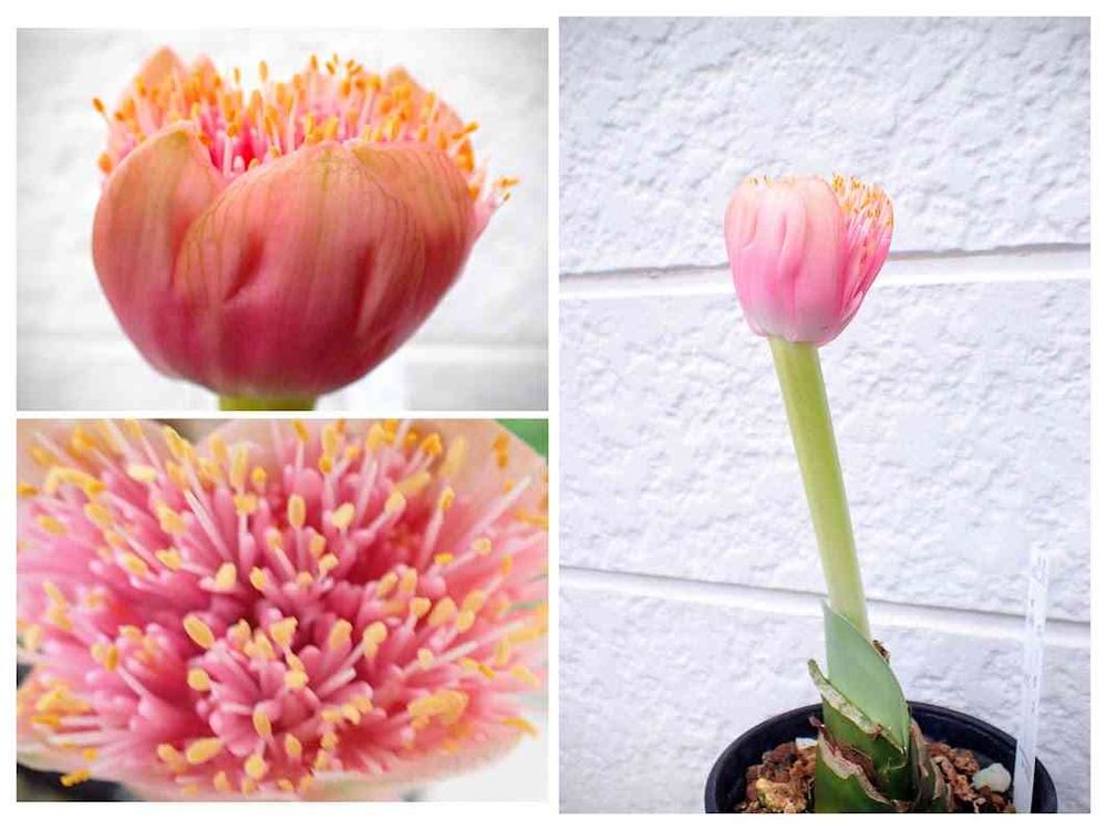 [@id:2327140] さん、コメントありがとうございます(*^▽^*)別名マユハケオモト・ロータスという名でも流通しているのですが、実際はマユハケオモト(ハエマンサス・アルビフロス)とは近縁ですが別種のハエマンサス・コッキネウスのピンク花変種のようです。マユハケオモトは常緑ですが、この種類は落葉して、花の後葉が出てくるのが異なります。思った以上にきれいですね😊💕😍