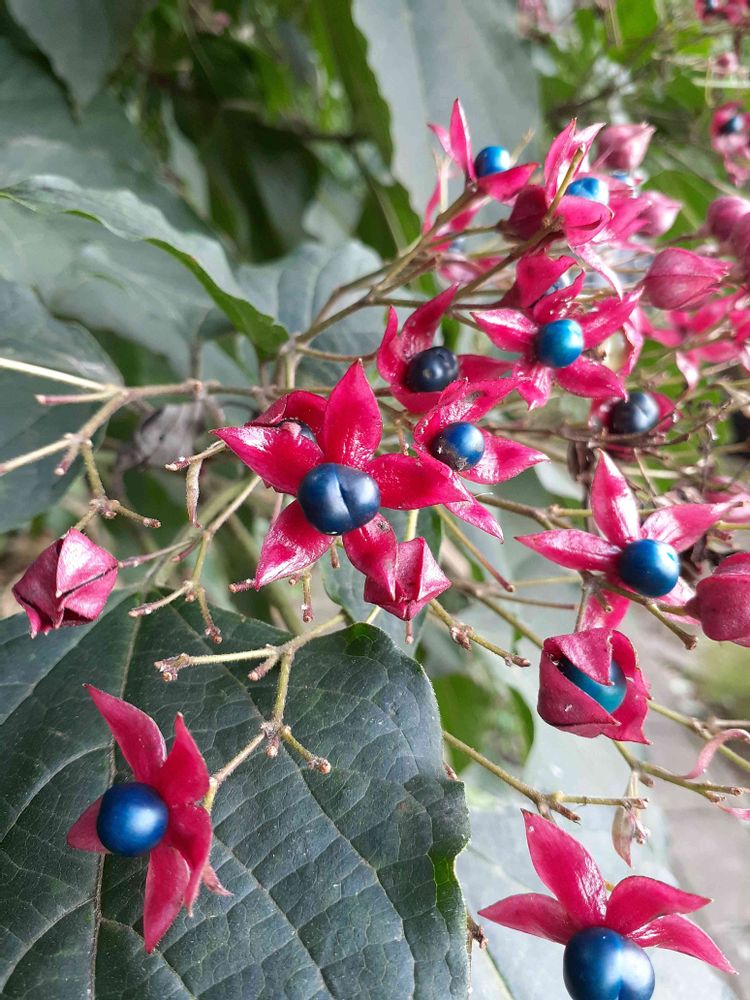 真っ白な可憐な花から、蒼い真珠💙のような実に、赤い星形❤️のマント(萼)をまとったような姿に変身します
