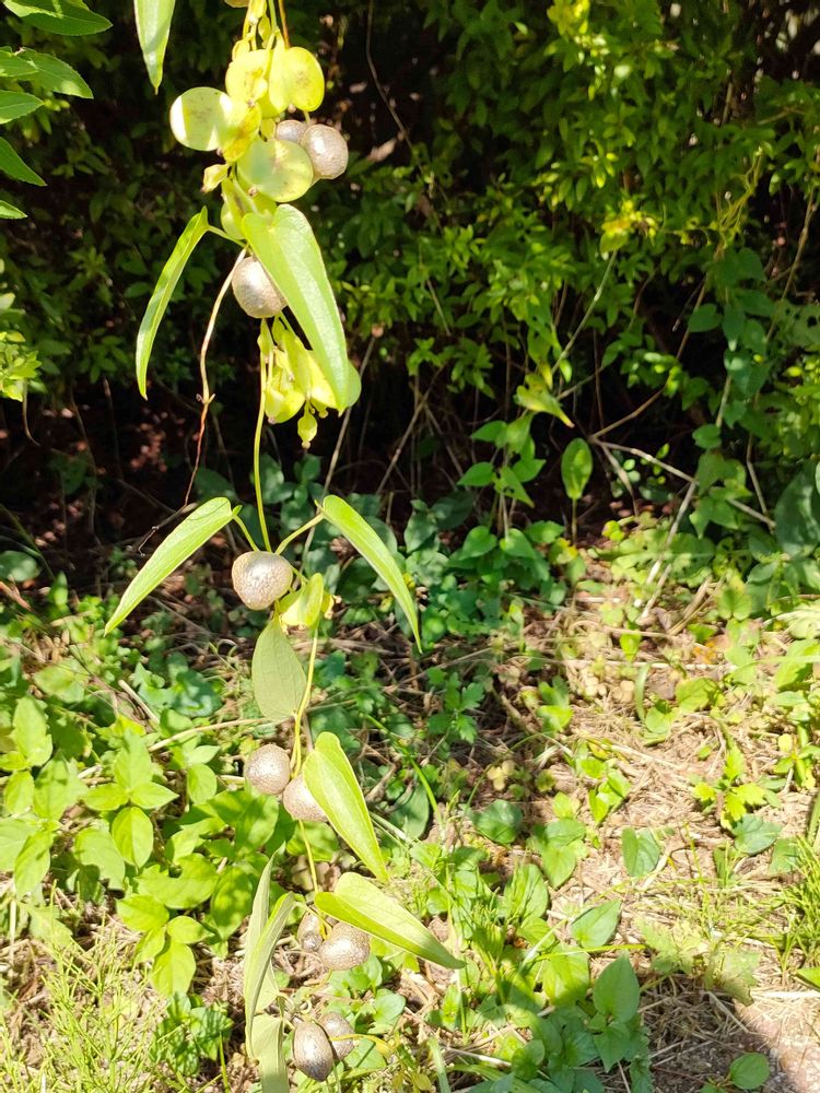 ツルが上から垂れて、小芋のような物がポコポコついてましてん。ムカゴだつたらいいのに……。何でしよう?