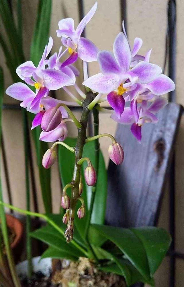 胡蝶蘭に焼杉を使い着生の勉強中汗だく😵💦小さな蘭だけに緊張😂蕾も咲きだしました💞