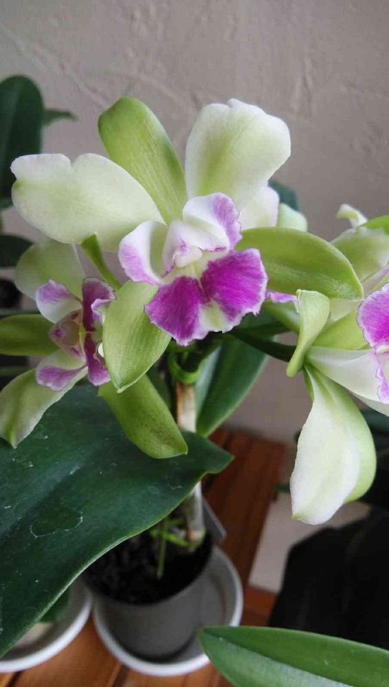 昨年お迎えした、ミニカトレアです!ミディタイプかなー✨ひとつの花茎にお花が、5個付いています!🎶