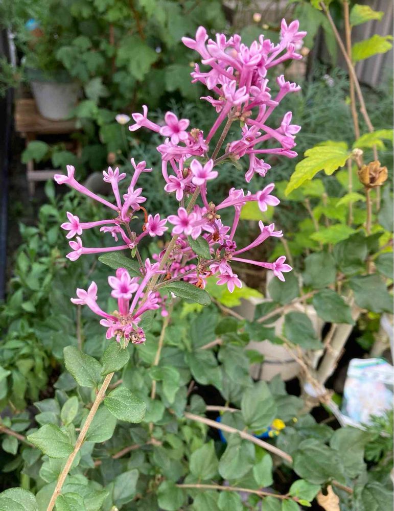 おはようございます☀姫ライラックが咲いています🌸この子は四季咲きでわりとずーっと咲いていてくれて優秀です☺️外壁工事のために、鉢がギューっと寄せて隅に置かれ、なんとか工事終わるまで水やりだけはしてもたせたい。。。😅
