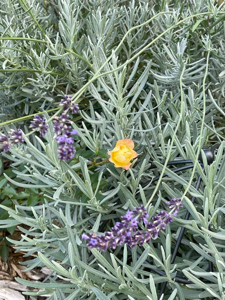ラベンダーの合間からひょこっと顔を出しているのは、ミニバラのイタリアンアイス