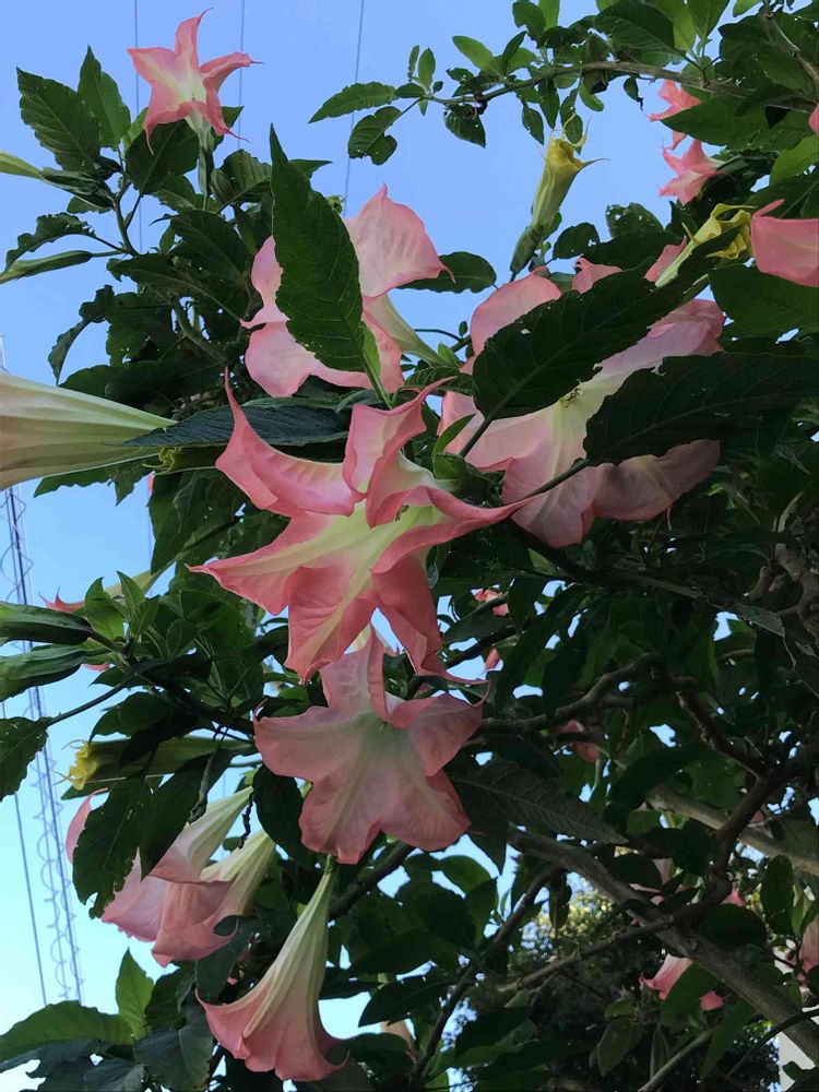 帰宅途中見たマーケット横の小径に降り注ぐエンジェルトランペットも、喜んでいるようです〜🧚🏻♀️🎶