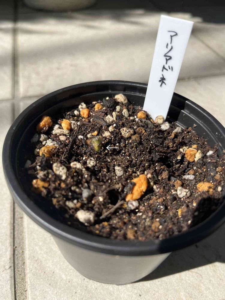 白かった芽が少し緑になってきて、ちょこんと飛び出てきた。