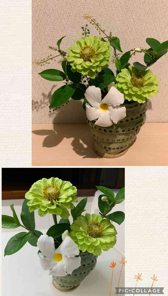 お花いいですね。私はジュズサンゴガ入りの方がいいとおもいます。季節感が出ることと、メインのお花と全く違うサイズや形を合わせることでお互いが引き立て合えるからです。この色のジニアだけでは少し暗い印象があったのでサンパラソルを加えたのでしょうか?白を加えることで全体が明るくなりましたね。いい感じに仕上がりました。器も素敵です。