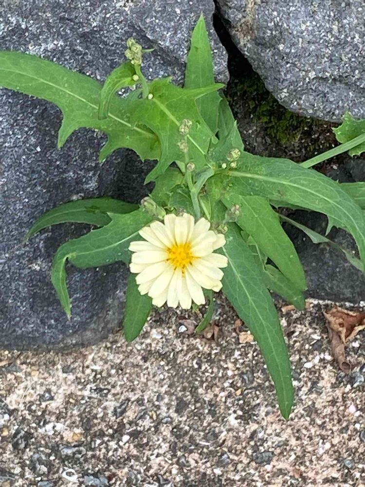 可愛い💕お花が石垣の隙間から咲いていました Googleレンズでは、アキノノゲシと教えてくれましたが???あってるかな🤔