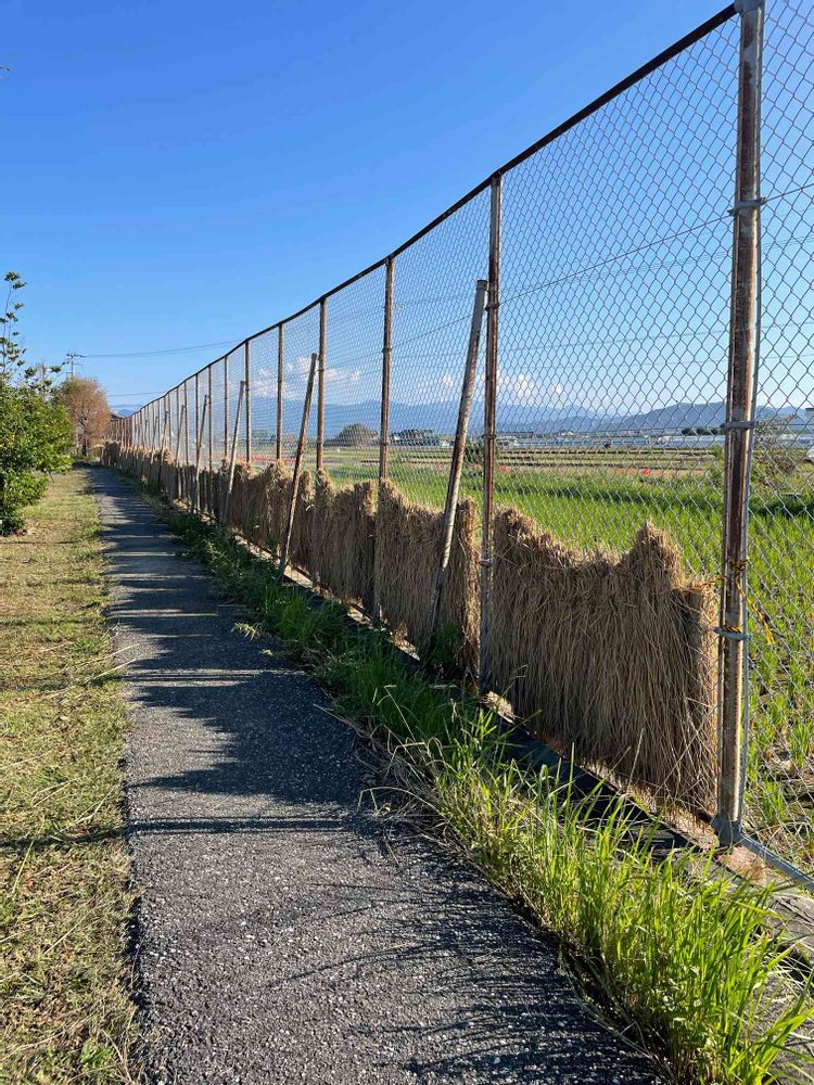 台風前に刈られ小学校のフェンスにかけられてます🌾🌾💛