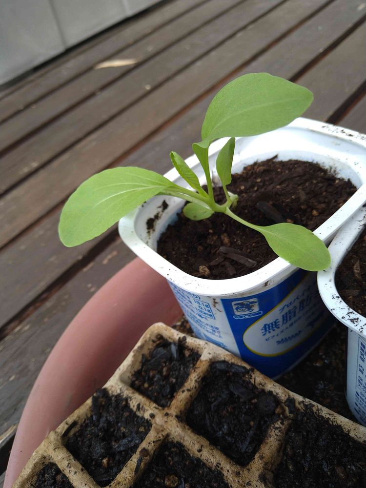 ヨーグルトカップにチンゲンサイを植え替えました。実験その2です。