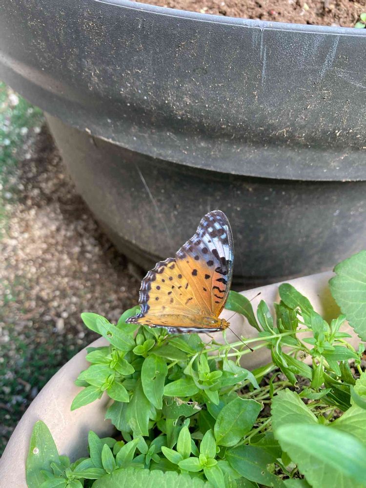 ヒョウモンさんが花もないのにお庭をひらひらと舞っています。